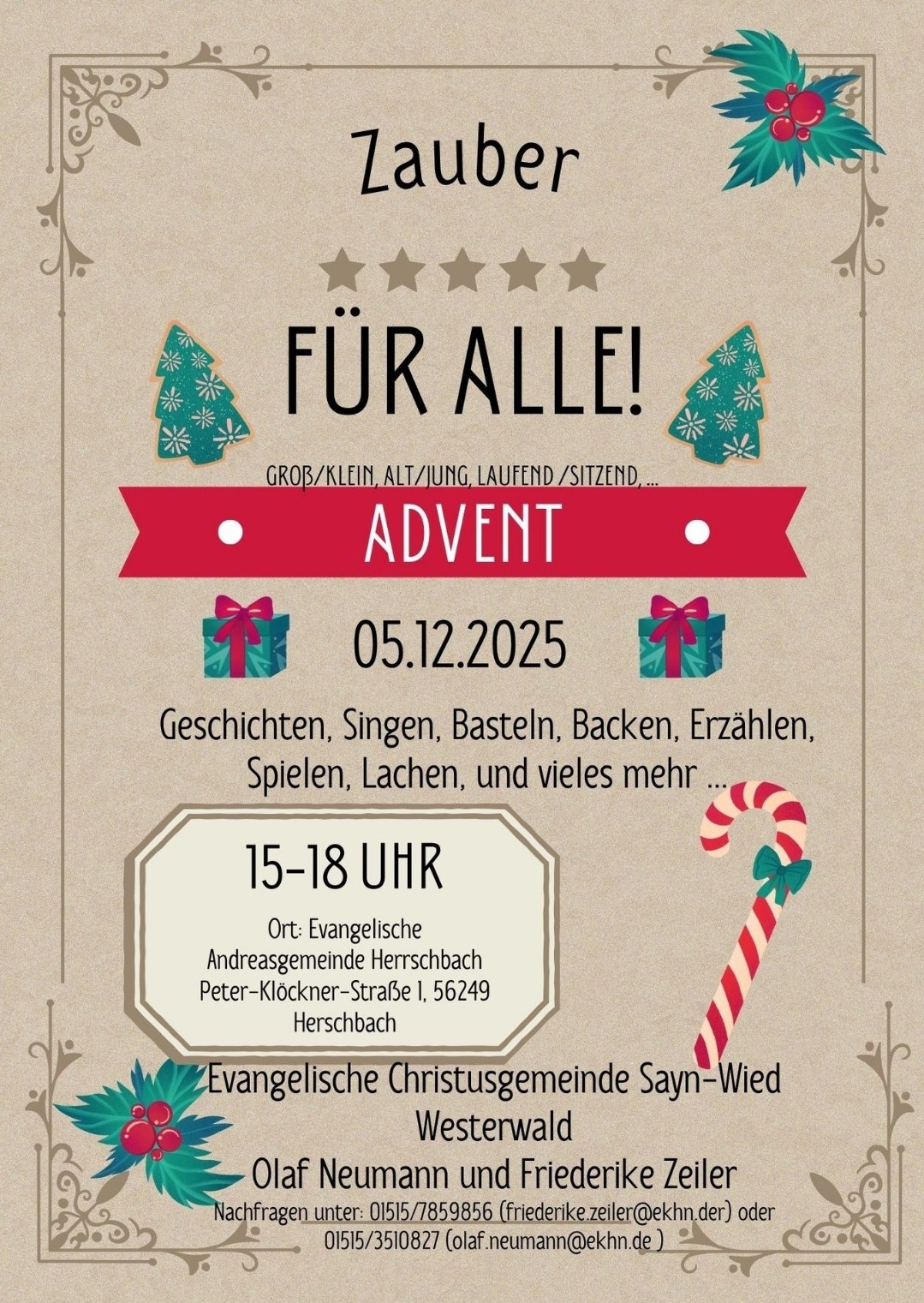 Am 05.12.2025 laden wir Jung und Alt, Groß und Klein herzlich zu unserem stimmungsvollen ADVENT in die Evangelische Andreasgemeinde Herschbach ein!